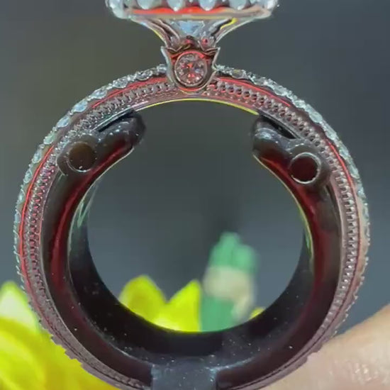 Made with round natural mined diamonds in the straight band and Cushion shape Halo and in Verragio symbol under center stone.