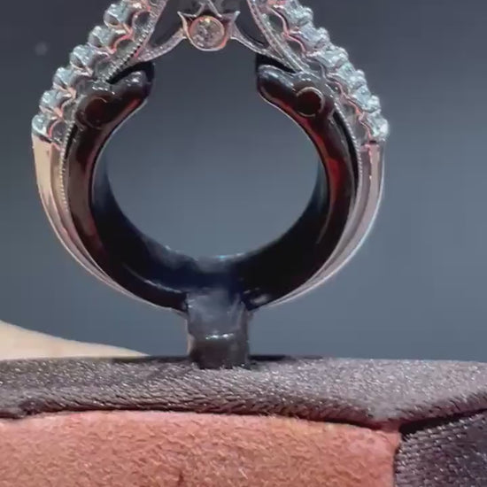 Made with round natural mined diamonds in the straight band and Verragio symbol under center stone.
