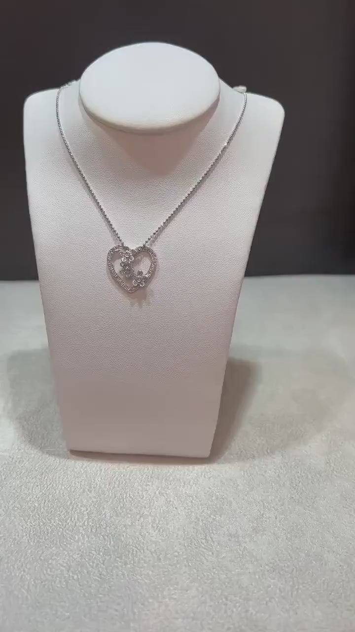 14K White Gold Diamond Heart with Flower Design. Diamond Heart has three diamond flowers in the middle. Round Genuine Diamonds are pave set. 0.23 carats total diamond weight. Chain is 14K 18” white gold diamond cut bead chain with a round safety lock.