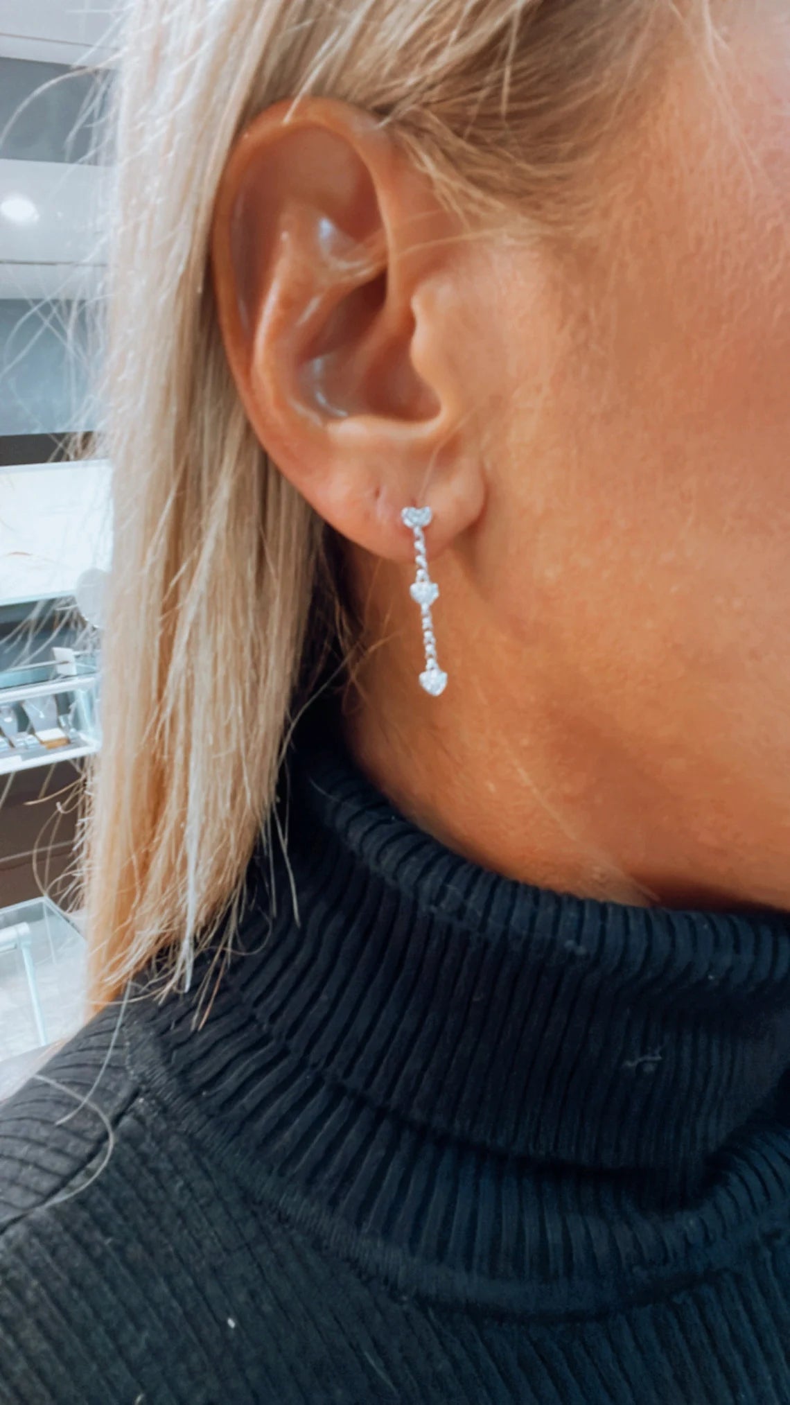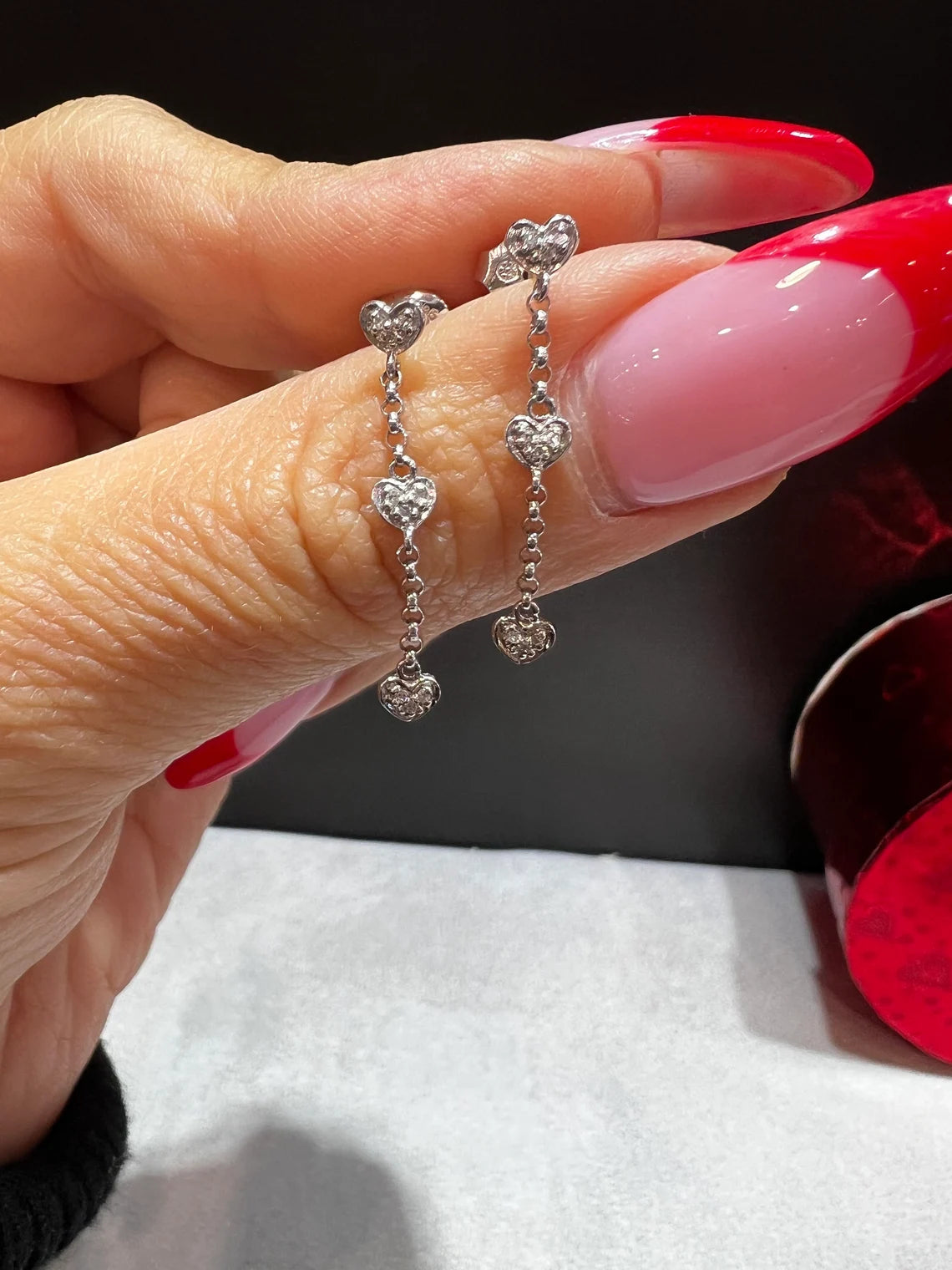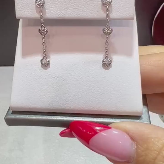 14K white gold diamond heart chain earrings. Three diamond heart stations on each earring. Earrings measure approximately 1 inch in length. Genuine natural round diamonds in each heart. 0.06 points total diamond weight. Earrings have push back closure.