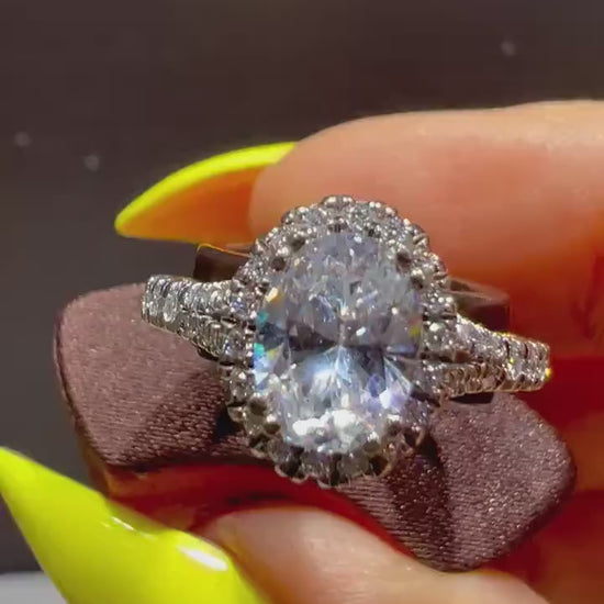 Made with round natural mined diamonds in the straight band and oval shape Halo and in Verragio symbol under center stone.