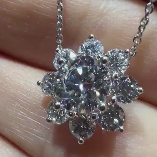 14K White Gold Lab Grown Diamond Flower Pendant. 2 Carat Center Diamond. 3.87 carats total diamond weight.