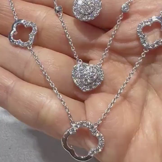 Diamond Multi Layered Charm Necklace 2.81 Carats with Heart, Clover, and Round Diamond Charms: Sterling Silver, Lab Grown Diamonds
