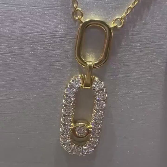 Double Oval Design with Pave Round Lab Grown Diamonds and a bezel set lab grown round diamond. Pendant is attached to chain.