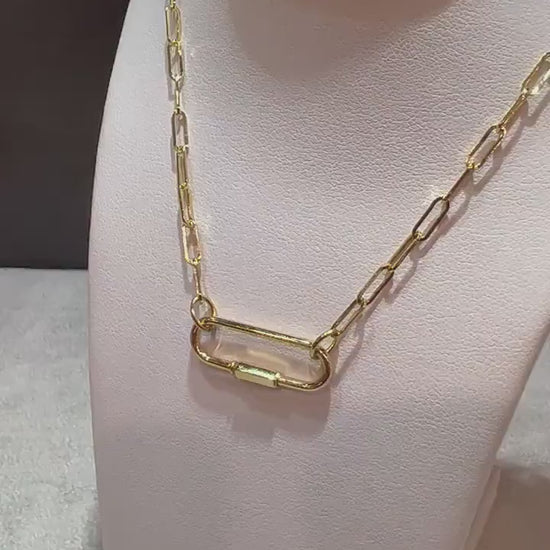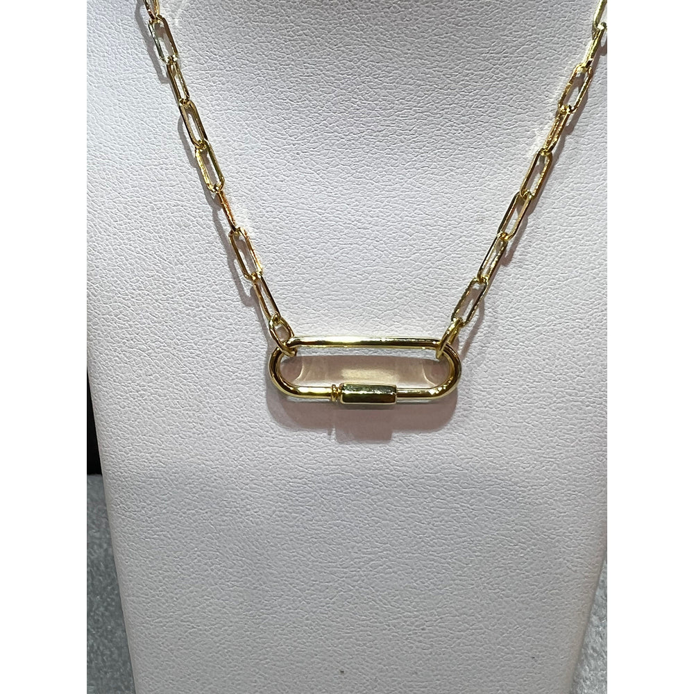 14K Yellow Gold Paperclip Link Necklace with attached Pendant. Paperclip Style Pendant has a screw lock with the option to hang a charm/charms on. The Oval Shape Pendant can be worn horizontally or vertically as shown in photos. The pendant measures 1 inch by 8.75MM. Necklace Length is 17”.